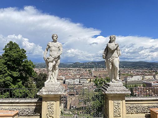 Una volta entrati nel giardino, si percorrono alcune rampe in salita bordate di piante di rose, si ammirano le statue, l'orto a forma di labirinto, la scalinata barocca, il frutteto e poi eccolo, il pergolato traboccante di fiori che porta al belvedere, affacciato su alberi e prati da cui emergono il Cupolone, il campanile di Giotto, Palazzo Vecchio, Santa Croce.