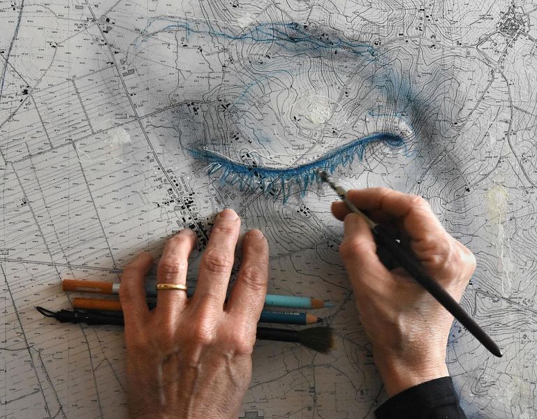 Nella nuova personale dell'artista aretina, corpi e volti emergono dalle linee predefinite di antiche mappe e con esse si confondono creando un'aurea di mistero.