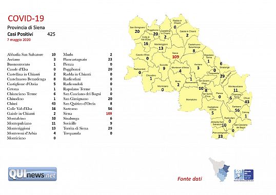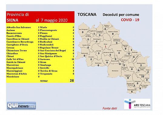 Fermo anche il dato sui decessi: nelle ultime 24 ore infatti non si sono registrate nuove vittime nel senese, dove le morti presumibilmente riconducibili al covid-19 sarebbero finora state 28.